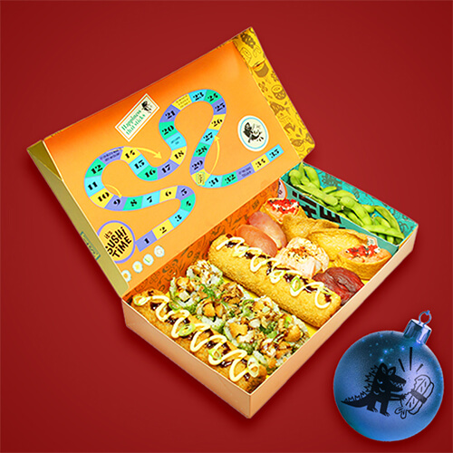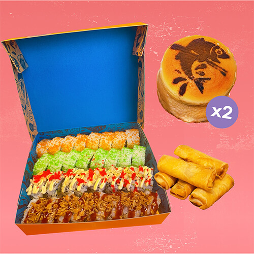Uramaki Krab 8st, Uramaki Spicy Krab 8st, Uramaki Zalm 8st, Uramaki Spicy Tonijn 8st, Crunchy Ebi Roll 8st, Crispy Chicken Roll 8st, Hosomaki Avocado 4st, Hosomaki Komkommer 4st, Hosomaki Zalm 4st, Hosomaki Tonijn 4st, Hoso Spicy Tuna 4st, Hoso Omelette 4st, Nigiri Zalm 5x, Nigiri Tonijn 5x, Portie Edamame Boontjes.